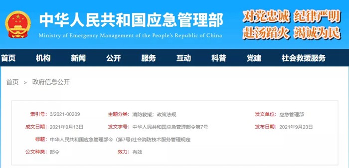 今日,應(yīng)急管理部發(fā)布公告:《社會(huì)消防技術(shù)服務(wù)管理規(guī)定》已經(jīng)2021年8月17日應(yīng)急管理部第27次部務(wù)會(huì)議審議通過(guò),現(xiàn)予公布,自2021年11月9日起施行(華人民共和國(guó)應(yīng)急管理部令第7號(hào)),全文如下: