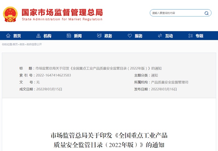 市場(chǎng)監(jiān)管總局關(guān)于印發(fā)《全國(guó)重點(diǎn)工業(yè)產(chǎn)品質(zhì)量安全監(jiān)管目錄(2022年版)》的通知